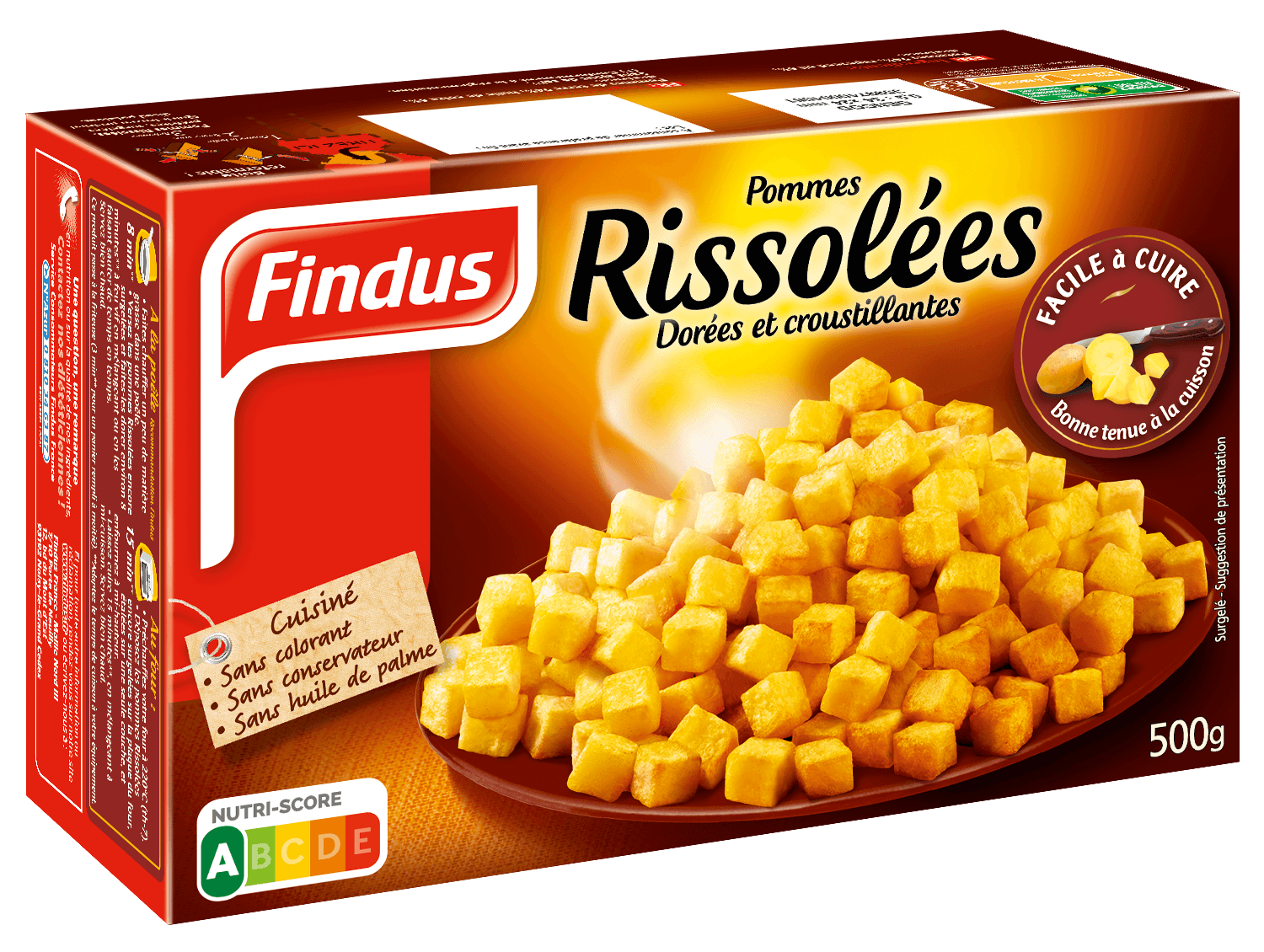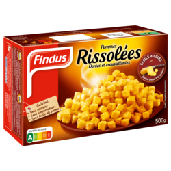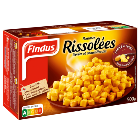 (Pour la boîte entière) Au four 15 min (Recommandé par Findus): Préchauffez votre four à 220°C (chaleur tournante). Déposez les Pommes Rissolées encore surgelées en une seule couche, sur la plaque du four recouverte de papier cuisson. Enfournez-les à mi-hauteur, et laissez-les cuire 15 minutes. Sortez la plaque à mi-cuisson et mélangez-les avec une spatule. C'est prêt lorsque vos Pommes Rissolées sont jaune doré et croustillantes !À la poêle 10 min : Faites chauffer un peu de matière grasse dans une poêle. Versez les pommes Rissolées encore surgelées et faites-les dorer environ 10 minutes à feu vif en mélangeant tout au long de la cuisson. C'est prêt lorsque vos Pommes Rissolées sont jaune doré et croustillantes ! *Adaptez le temps de cuisson à votre équipement. Pour de plus petites quantités, réduisez le temps de cuisson, afin d'éviter un brunissement excessif du produit. Ne cuisez pas plus que nécessaire.