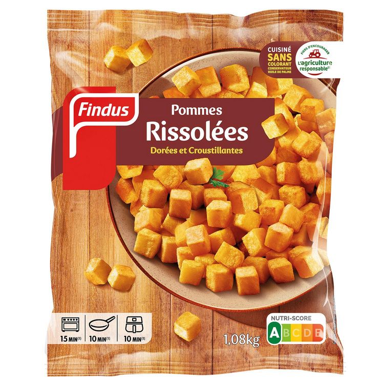 Au four 15min(1) (Recommandé par Findus) (pour 4 portions) : Préchauffez votre four à 220°C (chaleur tournante). Déposez 480g de Pommes Rissolées encore surgelées en une couche, sur la plaque du four recouverte de papier cuisson. Enfournez-les à mi-hauteur, et laissez-les cuire 15 minutes(1). Sortez la plaque à mi-cuisson et mélangez-les avec une spatule. A la poêle 10min(1) (pour 4 portions) : Faites chauffer un peu de matière grasse dans une poêle. Versez 480g de Pommes Rissolées encore surgelées et faites-les dorer environ 10 minutes(1) à feu vif en mélangeant tout au long de la cuisson. A la friteuse sans huile 10min(1) (pour 2 portions) : Préchauffez votre friteuse sans huile 4 minutes à 200°C. Déposez 240g de Pommes Rissolées encore surgelées dans le panier cuisson et laissez cuire environ 10 minutes(1) en remuant à mi-cuisson. C'est prêt lorsque vos Pommes Rissolées sont jaune doré et croustillantes! (1)Adaptez le temps de cuisson à votre équipement. Pour de plus petites quantités, réduisez le temps de cuisson, afin d'éviter un brunissement excessif du produit. Ne cuisez pas plus que nécessaire.