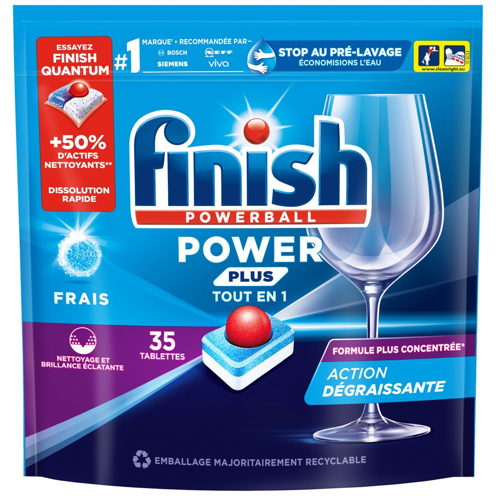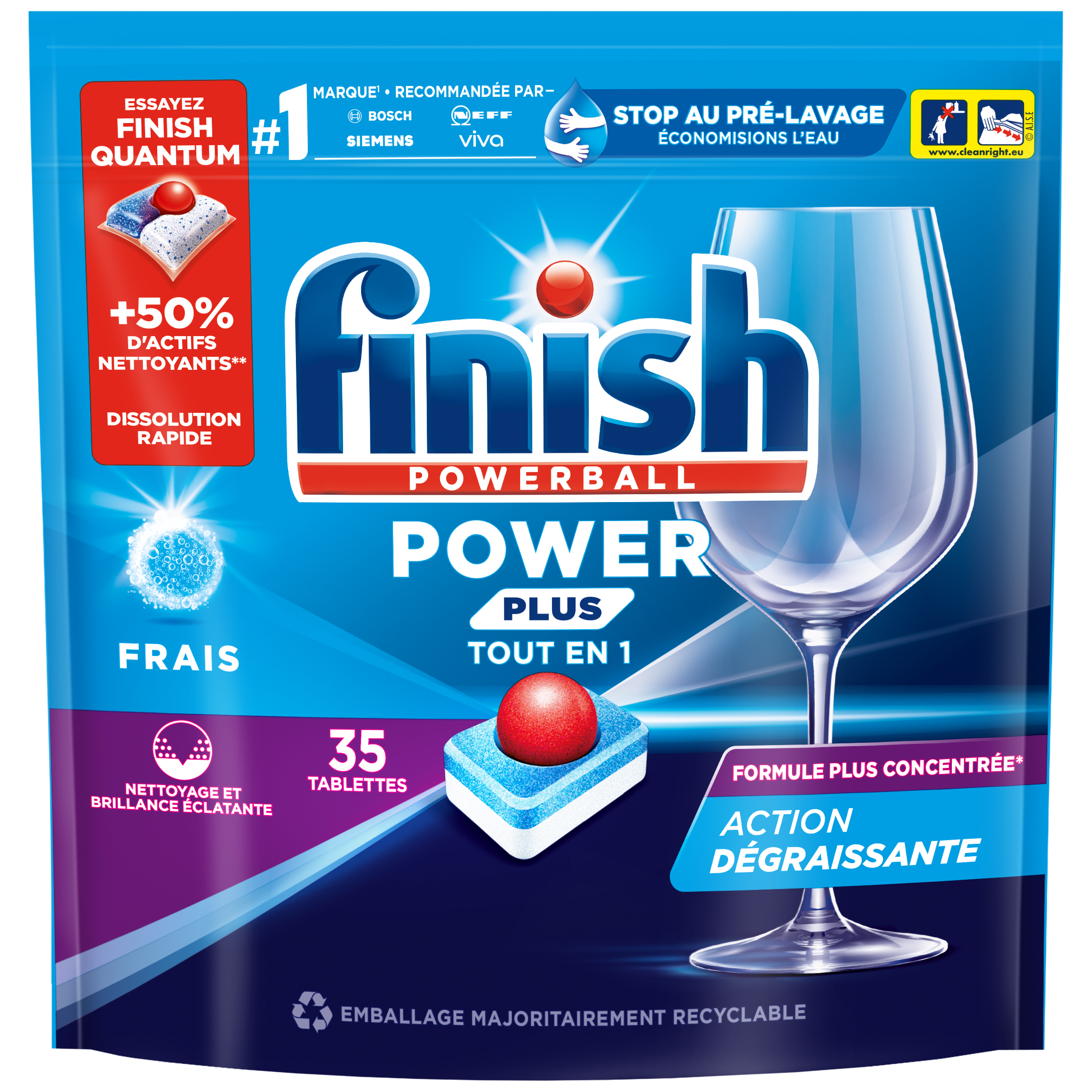 Finish Power Plus: notre solution Tout en 1 pour votre vaisselle. Notre Powerball amplifie le pouvoir désincrustant de la tablette, pour un nettoyage en profondeur et un résultat impeccable du 1er coup, à chaque lavage !