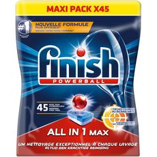 tablettes lave vaisselle Tout en 1 x45 Finish Tout en 1 Max Graisses Incrustées gagne contre toutes les tâches. La powerball libère de puissants agents qui éliminent les résidus même les plus incrustées pour un nettoyage intense et un résultat impeccable à chaque fois, dès le premier lavage.