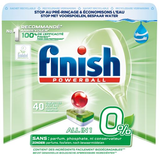 Finish 0% nettoie les tâches même les plus tenaces ! Notre Powerball libère de puissants agents qui aident à éliminer les résidus même les plus incrustés pour un nettoyage intense et un résultat impeccable dès le premier lavage. La technologie Finish est recommandée par de nombreuses marques de lave-vaisselle (Bosch, Beko, Siemens, NEFF). Finish Tout en 1 0% x40 tablettes