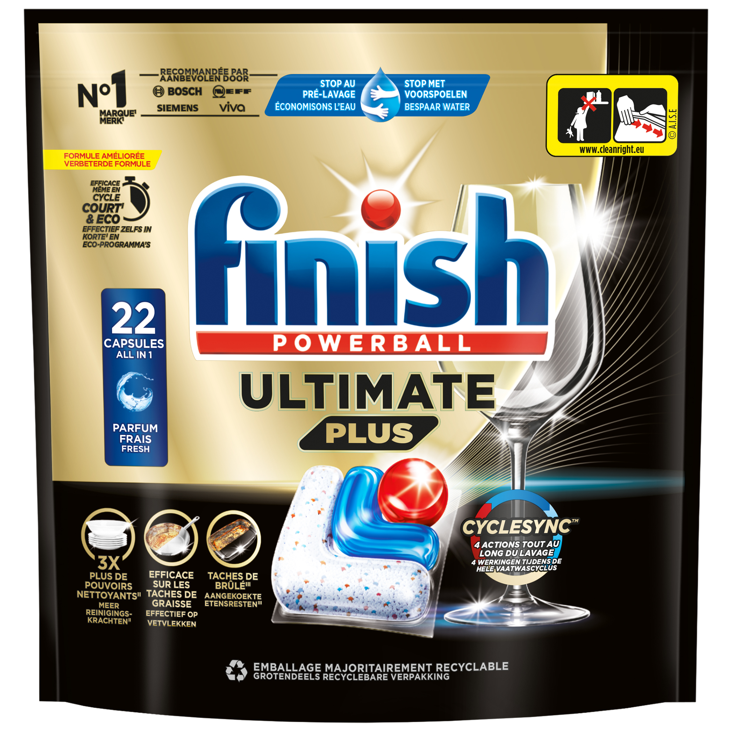 Avec Finish Ultimate Plus Tout en 1 obtenez une brillance étincelante et une propreté intense du 1er coup, à chaque lavage. Notre nouvelle technologie, CyclesyncTM libère les ingrédients* de façon séquentielle pour un lavage optimal. Grâce à ses 4 actions tout au long de cycle de lavage, cette technologie est efficace même contre les taches de brûlé et cela sans besoin de pré-laver. Nos capsules protègent et prennent soin de votre vaisselle tout en conservant sa brillance lavage aprés lavage.