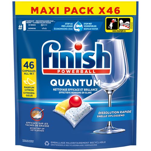 Avec Finish Quantum All in One Citron, obtenez un nettoyage en profondeur et une brillance éclatante du 1er coup, à chaque lavage ! Sa technologie capsule à trois-compartiments désincruste et élimine tous les types de résidus de nourriture - sans besoin de pré-laver votre vaisselle. La poudre et le gel agissent pour désincrustrer et éliminer les residus. La powerball protège le verres et aide a préserver l'éclat de votre vaisselle.