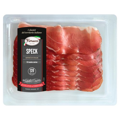 Laissez vous séduire par le Speck Fiorucci : de fines tranches de jambon cru fumé, traditionnellement fabriqué dans le Tyrol italien.