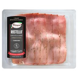 Découvrez l'emblème de la Rostelleria italienne : le Rostello Fiorucci. Un jambon cuit assaisonné d'un mélange secret de 10 herbes aromatiques, cuit très lentement à la vapeur puis rôti à très haute température pour une texture et une saveur inimitables. En version tranchée pour plus de praticité