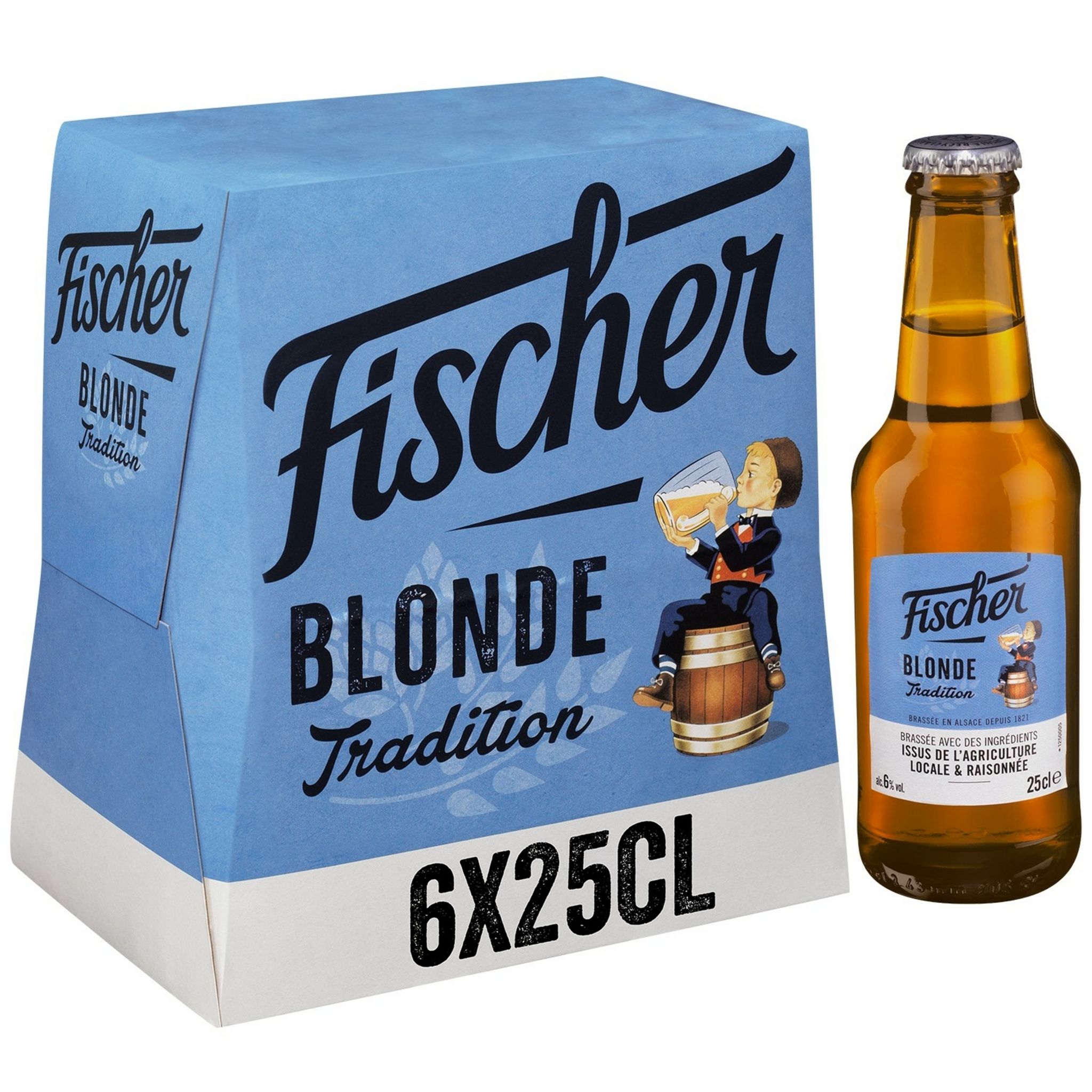 Pack de 6 bouteilles 25 cl. De fermentation basse, type pils, Fischer ® Tradition est brassée avec du malt d'orge et des houblons d'Alsace. Cette bière blonde se distingue par son goût intense de céréales mûres et sa douce amertume.