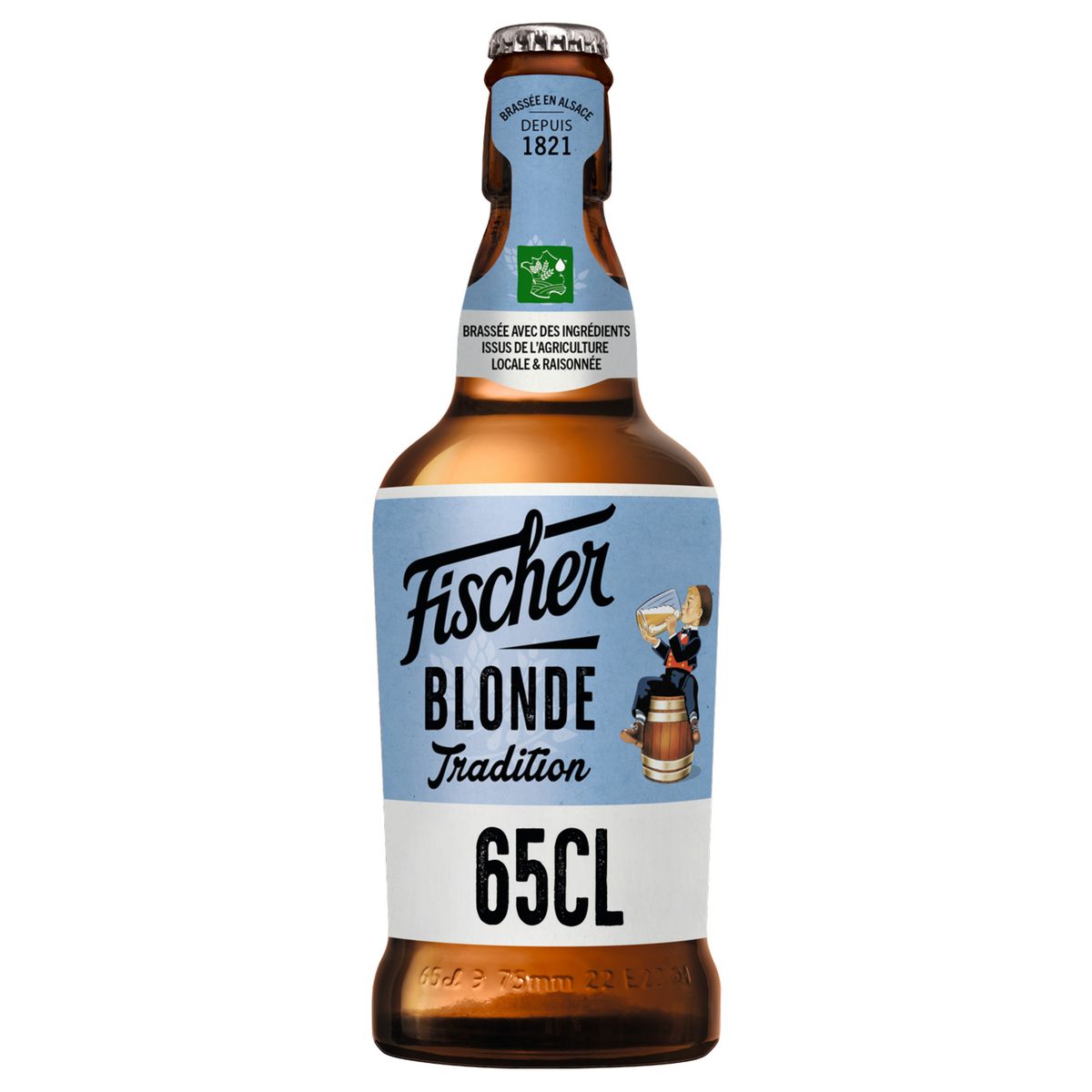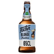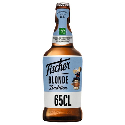 Bouteille 65 cl. 6 % volume d'alcool. De fermentation basse, type pils, Fischer ® Tradition est brassée avec du malt d'orge et des houblons d'Alsace. Cette bière blonde se distingue par son goût intense de céréales mûres et sa douce amertume.