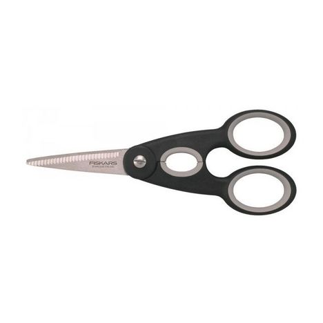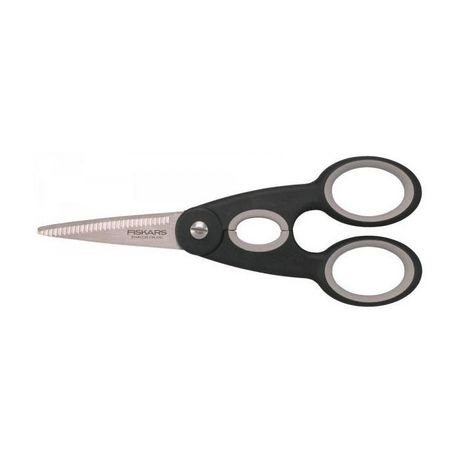 Fiskars 1003034 NOIR Ciseaux de cuisine 2 en 1 1003034 noir Fiskar. Ses anneaux ergonomiques, avec revêtement intérieur antiglisse, assurent une prise en main sûre. Robuste, ses lames striées avec encoche permettent de découper facilement sans déraper. Son anneau central permet de dévisser les boute