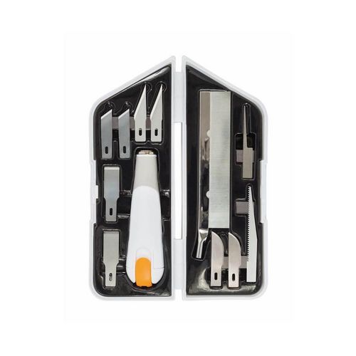 - Inclus 7 styles de lames et un total de 11 lames : deux lames #2 Précision, une lame #15 Scie à guichet, deux lames #18 Ciselage, deux lames #19 Incurvée, deux lames #22 Sculpture & Incurvée, une lame #27 Scie et une Scie à dents.