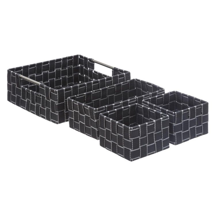 Ce lot de 4 paniers sera idéale pour optimiser l'espace de rangement dans votre salle de bain.FICHE TECHNIQUE- 4 paniers de rangement.- Modèles tressés.- Couleur : Gris foncé et blanc.- Matière : Polypropylène.- Structure en métal.CARACTERISTIQUES TECHNIQUES- Dimensions globales : Longueur 28 cm x L
