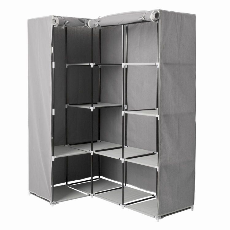 Armoire d'angle avec 1 penderie et 10 étagères - Gris