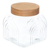 Informations Techniques : Dimensions : L. 15,7 x l. 15,5 x H. 15,7 cm Matières : Verre & Bois (Acacia) Spécificités : Pratique & Utile Bocal de conservation Avec couvercle en bois Motifs arches en relief Contenance : 2,4 L Poids : 0,91 kg Couleur : Transparent