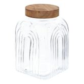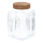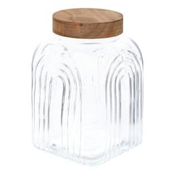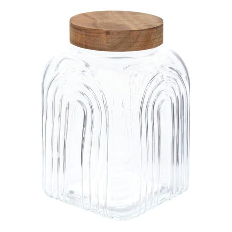 Informations Techniques : Dimensions : L. 15,7 x l. 15,7 x H. 23,3 cm Matières : Verre & Bois (Acacia) Spécificités : Pratique & Utile Bocal de conservation Avec couvercle en bois Motifs arches en relief Contenance : 4 L Poids : 1,33 kg Couleur : Transparent