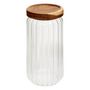 Informations Techniques : Dimensions : D. 9 x H. 20,4 cm Matières : Bocal : Verre borosilicate Couvercle : Bois (Acacia) Spécificités : Pratique & Utile Bocal de conservation Couvercle hermétique Pot en verre rainurée Contenance: 1 L Poids : 0,36 kg Couleur : Transparent & Naturel