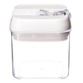 Informations Techniques : Dimensions : L. 10 x l. 10 x H. 10,5 cm Matières : Polystyrène, Silicone & Polypropylène Spécificités : Bocal Hérmetique Pratique & Astucieux Contenance : 500 ml Poids : 0,180 kg Couleur : Blanc & Transparent