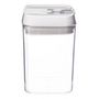 Informations Techniques : Dimensions : L. 10 x l. 10 x H. 15,5 cm Matières : Polystyrène, Silicone & Polypropylène Spécificités : Bocal Hérmetique Pratique & Astucieux Contenance : 800 ml Poids : 0,220 kg Couleur : Blanc & Transparent