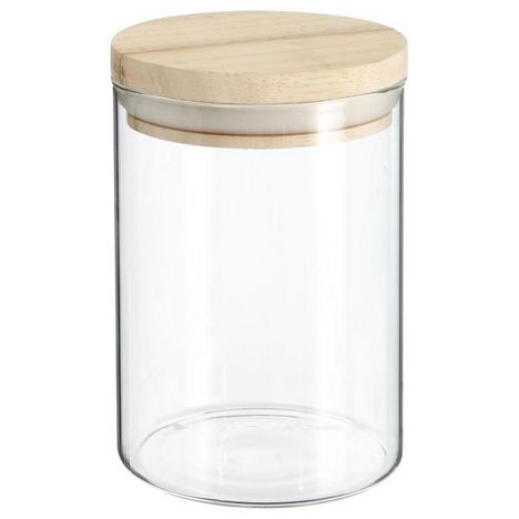 Informations Techniques : Dimensions : D. 10 x H. 14 cm Sans couvercle : D. 9,5 cm Matières : Verre & Bois (Hévéa) Spécificités : Pratique & Utile Bocal hermétique Couvercle en bois Contenance : 600 ml Poids : 0,33 kg Couleur : Naturel & Transparent