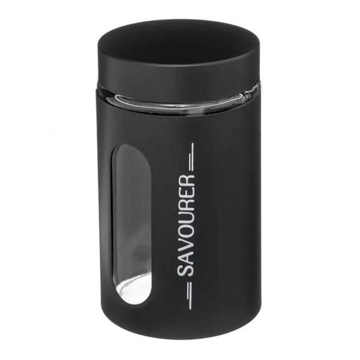 Informations Techniques : Dimensions : H. 17,5 x D. 10 cm Matière : Verre Spécificités : Tendance & Pratique Bocal de conservation Contenance : 0,9L Inscription savourer Facile d'utilisation & d'entretien Poids : 0,7 kg Couleur : Noir
