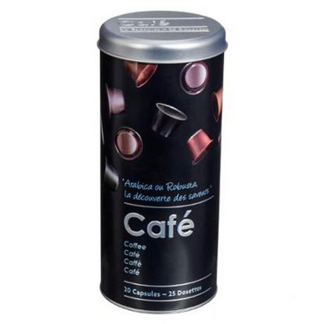 Informations Techniques : Dimensions : D. 7,8 x H. 17,8 cm Matière : Métal Spécificités : Pratique & Utile Boîte à Capsules de Café Contenance : 20 capsules / 25 dosettes Poids : 0,1 kg Couleur : Noir