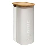 Informations Techniques : Dimensions : L. 9 x l. 13 x H. 21,5 cm Matières : Verre & Bambou Spécificités : Empilable & Hermétique Boîte de conservation à farine Inscription Farine Couvercle en bambou Certifié FSC Capacité : 1,6 L Compatibilité : Lave-vaisselle (sauf couvercle) Poids : 0,46 kg Coule