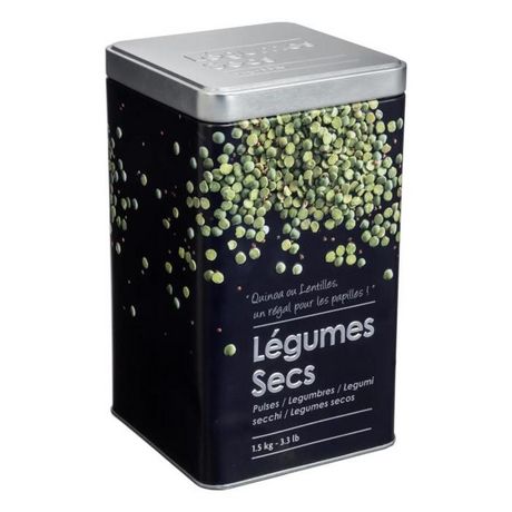 Informations Techniques : Dimensions : L. 10,8 x l. 10,8 x H. 18,4 cm Matière : Métal Spécificités : Pratique & Utile Boîte à Légumes Secs Contenance : 1,5 kg Couleur : Noir