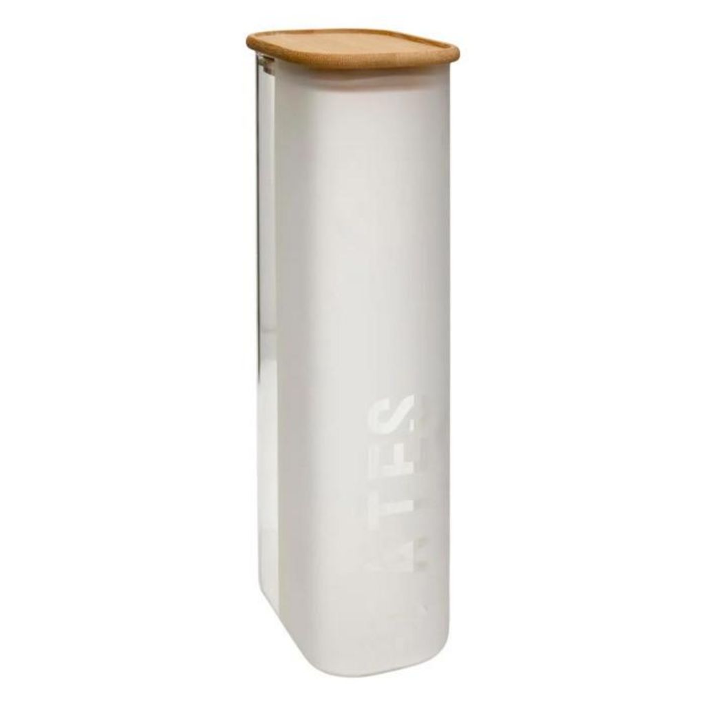 Informations Techniques : Dimensions : L. 9 x l. 13 x H. 30,2 cm Matières : Verre & Bambou Spécificités : Empilable & Hermétique Boîte de conservation à pâtes Inscription Pâtes Couvercle en bambou Certifié FSC Capacité : 2,25 L Compatibilité : Lave-vaisselle (sauf couvercle) Poids : 0,63 kg Couleu