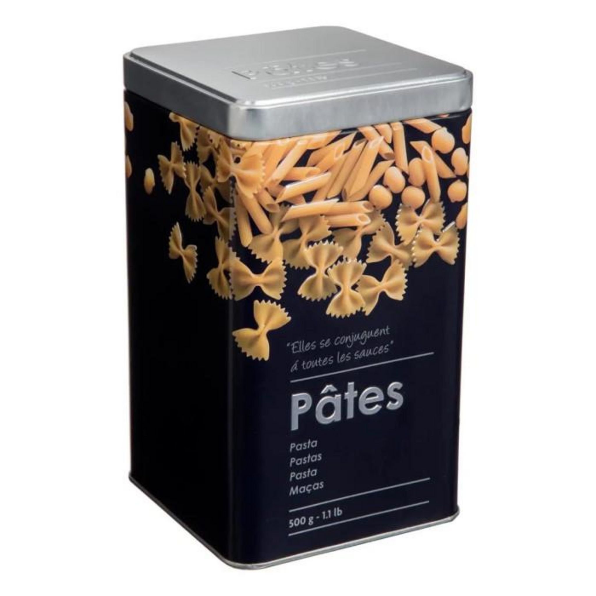 Informations Techniques : Dimensions : L. 10,8 x l. 10,8 x H. 18,4 cm Matière : Métal Spécificités : Pratique & Utile Boîte Pâtes Design Relief Capacité : 0,5 kg Couleur : Noir