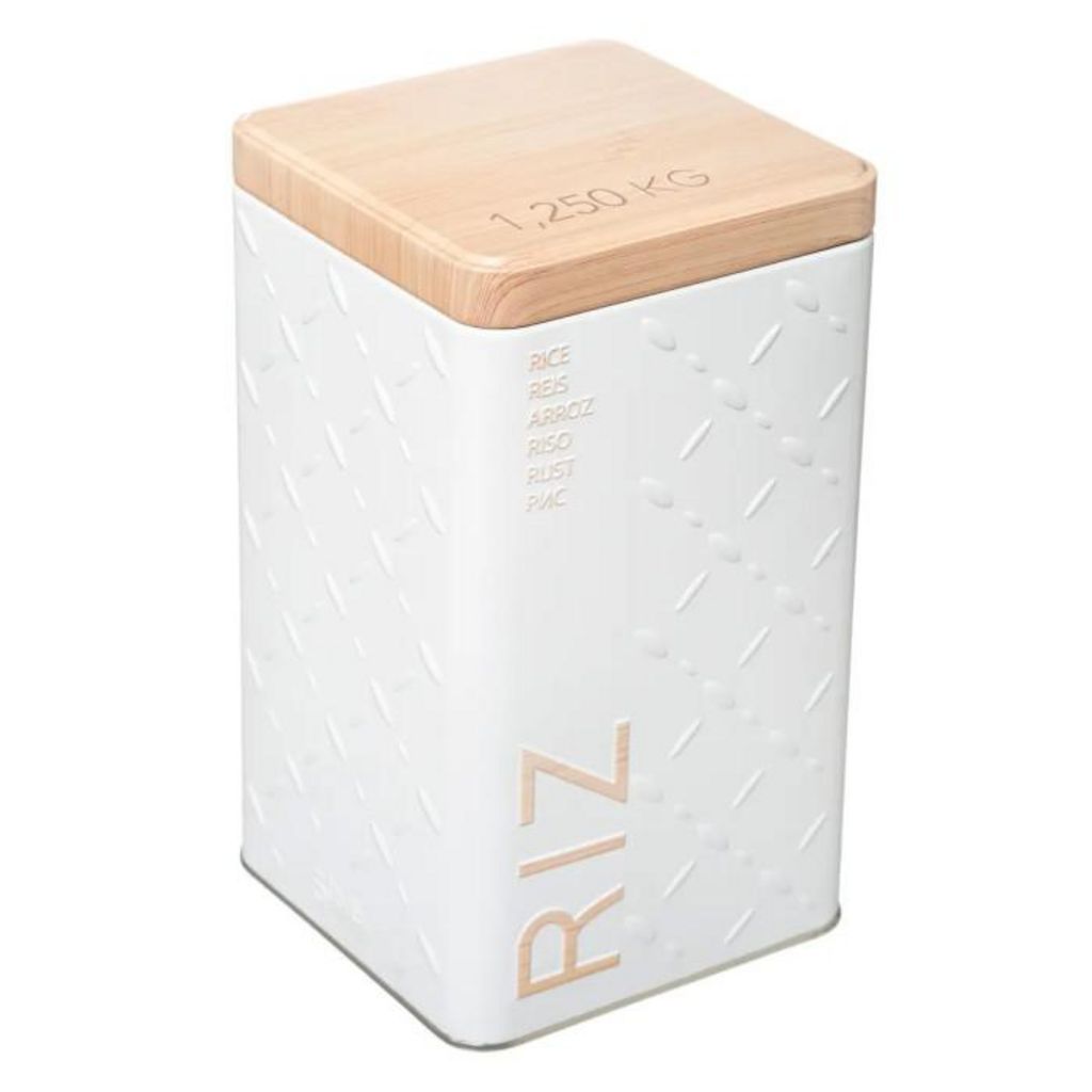 Informations Techniques : Dimensions : L. 10,5 x l. 10,5 x H. 18,5 cm Matières : Fer & Etain Spécificités : Pratique & Utile Boîte à Riz Style Scandinave Forme Carrée Contenance : 1,25 kg Facile d'entretien & d'utilisation Poids : 0,18 kg Couleur : Blanc