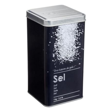 Informations Techniques : Dimensions : L. 8,8 x l. 8,8 x H. 17 cm Matière : Métal Spécificités : Pratique & Utile Boîte à Sel A Motifs Contenance : 1 kg Couleur : Noir
