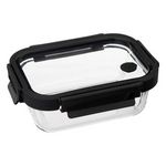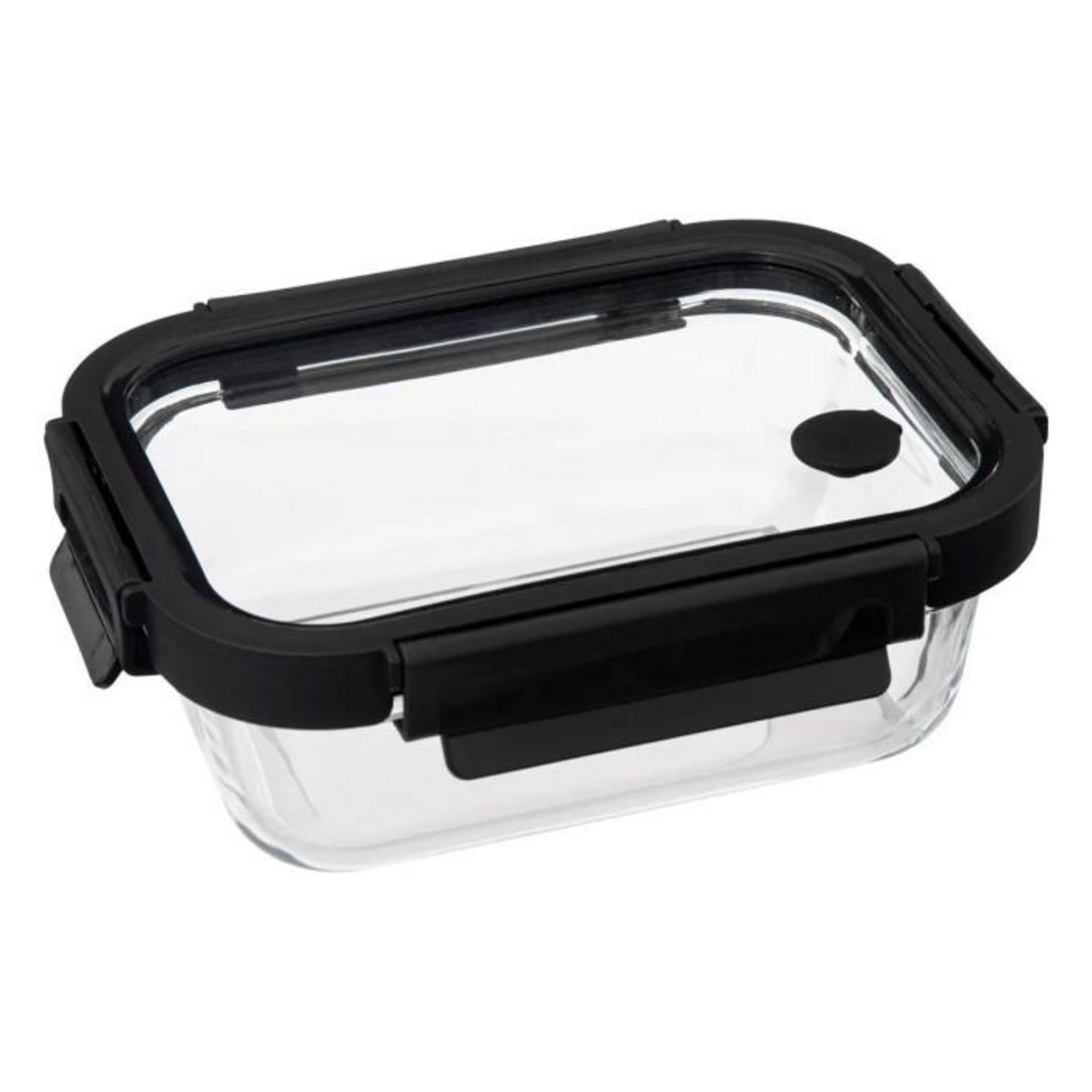 Informations Techniques : Dimensions : L. 19 x l. 14,5 x H. 6,85 cm Matière : Verre Spécificités : Pratique & Utile Boîte rectangulaire Couvercle en verre trempé Avec fermeture étanche à clips Joint hermétique et valve d'aération Capacité : 0,5 L Poids : 0,52 kg Couleur : Noir & Transparent