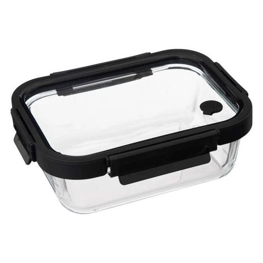 Informations Techniques : Dimensions : L. 21,7 x l. 17 x H. 7,43 cm Matière : Verre Spécificités : Pratique & Utile Boîte rectangulaire Couvercle en verre trempé Avec fermeture étanche à clips Joint hermétique et valve d'aération Capacité : 0,9 L Poids : 0,74 kg Couleur : Noir & Transparent