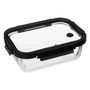 Informations Techniques : Dimensions : L. 23,7 x l. 18,5 x H. 7,9 cm Matière : Verre Spécificités : Pratique & Utile Boîte rectangulaire Couvercle en verre trempé Avec fermeture étanche à clips Joint hermétique et valve d'aération Capacité : 1,3 L Poids : 0,96 kg Couleur : Noir & Transparent