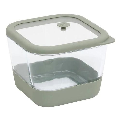 Informations Techniques : Dimensions : L. 15 x l. 15 x H. 11,4 cm Matière : Verre Borosilicate Spécificités : Pratique & Utile Boîte de conservation Valve hermétique Revêtement antiglisse Résistant de - 20°C à +200°C Compatibilités : Micro-ondes et lave-vaisselle Capacité : 1,35 L Poids : 0,92 kg C