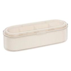 Informations Techniques : Dimensions : L. 27,2 x l. 10,5 x H. 8 cm Matières : Polypropylène & PET Spécificités : Pratique & Utile Boîte de rangement ovale Pour salle de bain Avec 4 compartiments Poids : 0,35 kg Couleur : Beige