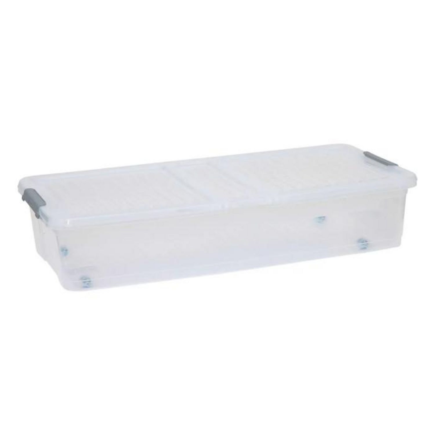 Informations Techniques : Dimensions : L. 77 x l. 38 x H. 27,5 cm Matière : Plastique Spécificités : Pratique & Utile Caisse de rangement Ouverture papillon Fermeture avec clips Déplacement facile avec 4 roulettes Se glisse facilement sous le lit Capacité : 33 L Couleur : Transparent