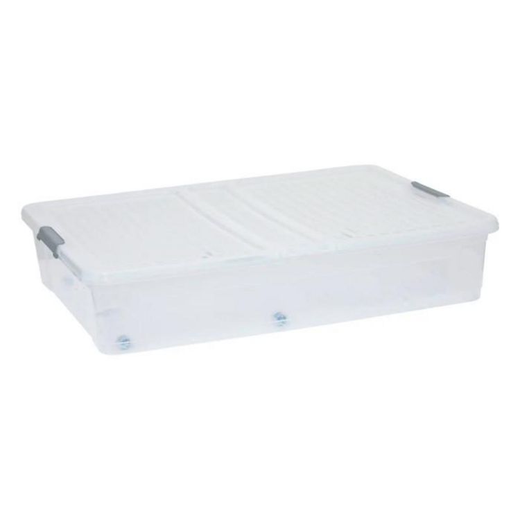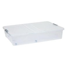 Informations Techniques : Dimensions : L. 76 x l. 57 x H. 16 cm Matière : Plastique Spécificités : Pratique & Utile Caisse de rangement Ouverture papillon Fermeture avec clips Déplacement facile avec 6 roulettes Se glisse facilement sous le lit Format large Capacité : 53 L Couleur : Transparent