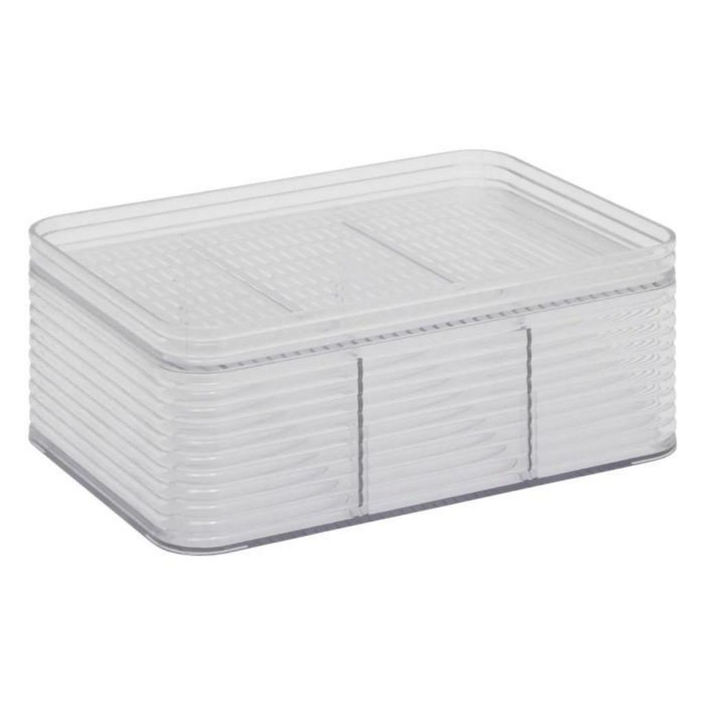 Informations Techniques : Dimensions : L. 22,5 x l. 15,3 x H. 9,3 cm Matière : PET Spécificités : Empilable & Utile Boîte de rangement organiseur Avec 3 compartiments amovibles Poids : 0,47 kg Couleur : Transparent