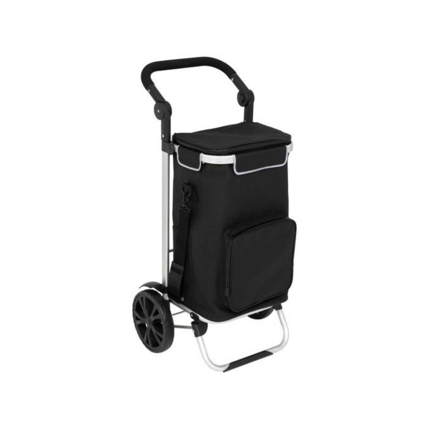 Informations Techniques : Dimensions : L. 45 x l. 36 x H. 97 cm Roues : D. 21 cm Matières : Aluminium & Polyester Spécificités : Pratique & Robuste Chariot de courses Sac isotherme Poignée hauteur réglable Grandes roues robustes Sac imperméable et amovible Sangle réglable Structure en aluminium C