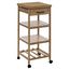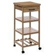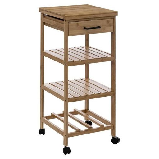 Informations Techniques : Dimensions : L. 38 x l. 37 x H. 90 cm Matière : Bambou Spécificités : Pratique & Utile Desserte de Cuisine 3 Niveaux Contient : Rack 4 Bouteilles 1 Tiroir avec Rangement Plan de Travail inclus Sur Roulettes Format Compact Idéal pour les Petites Cuisine Poids Maximal Support