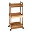 Informations Techniques : Dimensions : L. 40 x l. 30,5 x H. 84,5 cm Matières : Bois (Acacia) & MDF Spécificités : Pratique & Utile Desserte de cuisine 3 niveaux Avec roulettes dont 2 avec stopper À monter soi-même Poids : 3,36 kg Couleur : Marron