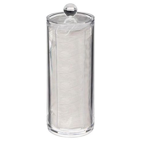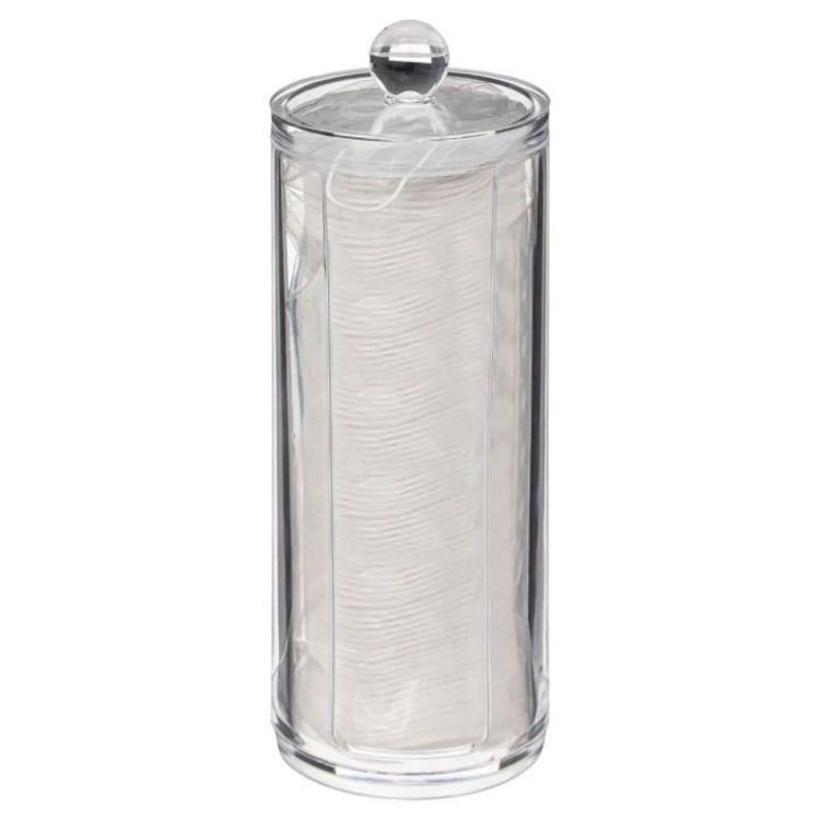 Informations Techniques : Dimensions : D. 7,5 x H. 20 cm Matières : Polystyrène & Coton Spécificités : Pratique & Résistant Distributeur à coton 80 disques démaquillants inclus Forme ronde Poids : 0,223 kg Couleur : Transparent