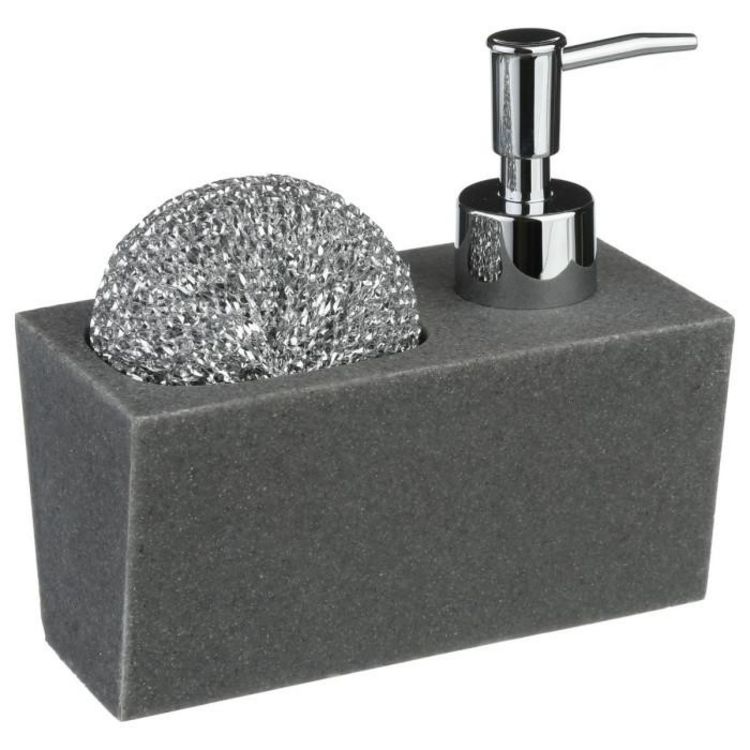 Informations Techniques : Dimensions : L. 14.5 x l. 7.3 x H. 13.4 cm Matière : Résine Spécificités : Distributeur de savon liquide rechargeable Pompe en PVC métallisé Avec porte éponge Poids : 0,68 kg Couleur : Gris foncé