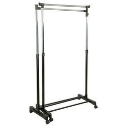 Informations Techniques : Dimensions : L. 86-161 x l. 43 x H. 108-174 cm Tubes : 38,1 mm Matières : Acier Spécificités : Pièces d'assemblage en plastique noir Pivotant à 180° Roulettes Multidirectionnelles Charge maximum : 20kg (soit 10kg/barre) Notice de montage incluse Couleur : Noir