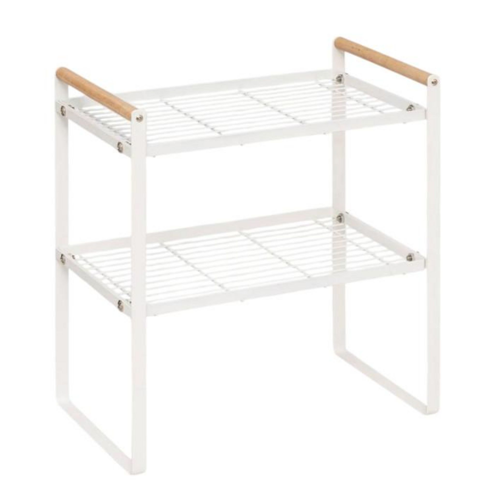 Informations Techniques : Dimensions : L. 33 x l. 21 x H. 37,5 cm Matière : Acier Spécificités : Ergonomique & Utile Étagère de cuisine 2 niveaux Avec 2 poignées latérales Gain de place À monter soi-même Poids : 1,38 kg Couleur : Blanc