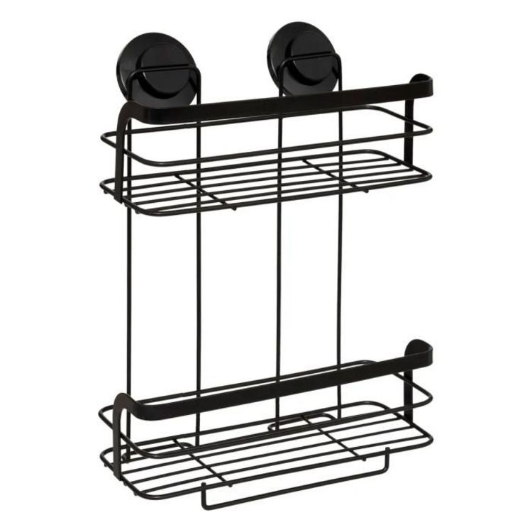 Informations Techniques : Dimensions : L. 25,5 x l. 12 x H. 34 cm Matière : Acier Spécificités : Pratique & Utile Étagère de douche 2 niveaux Avec 2 ventouses Poids max supporté : 4,5 kg Poids : 0,63 kg Couleur : Noir