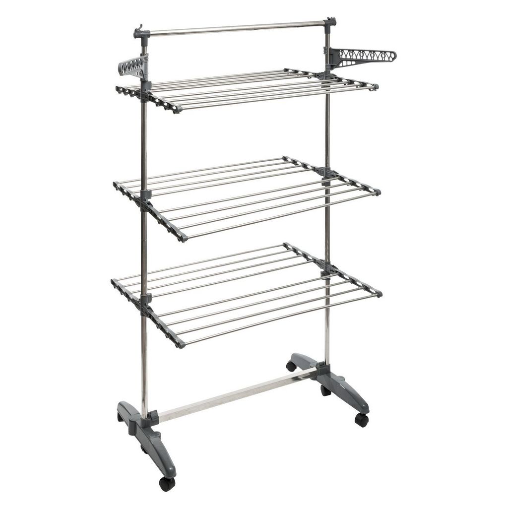 Etendoir 3 niveaux 6 roulettes avec porte cintres - Gris