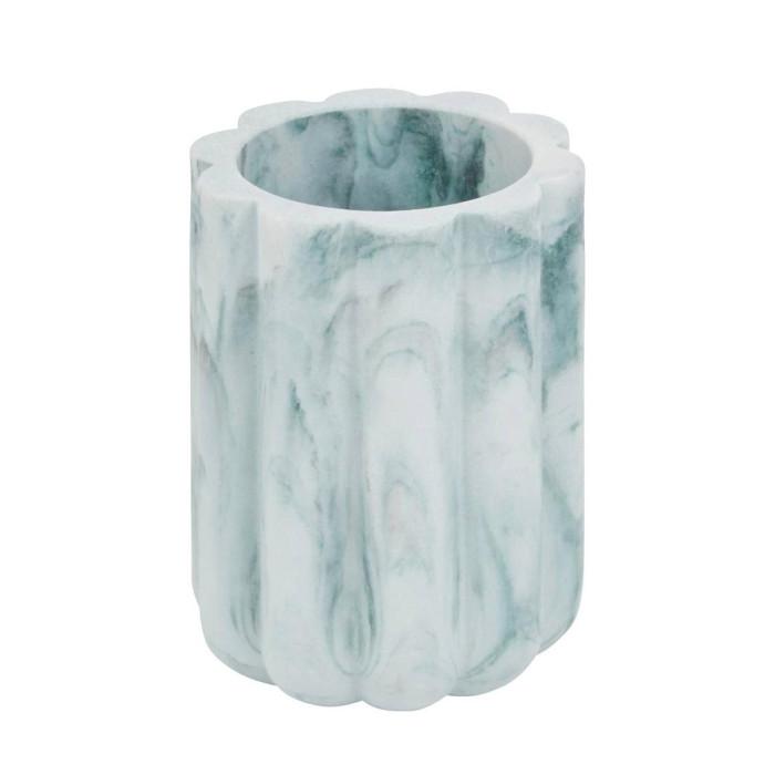 Informations Techniques : Dimensions : D. 7,8 x H. 11 cm Matière : Polyrésine Spécificités : Pratique & Déco Pot à brosse à dents Effet marbre Design ondulé Poids : 0,39 kg Couleur : Blanc