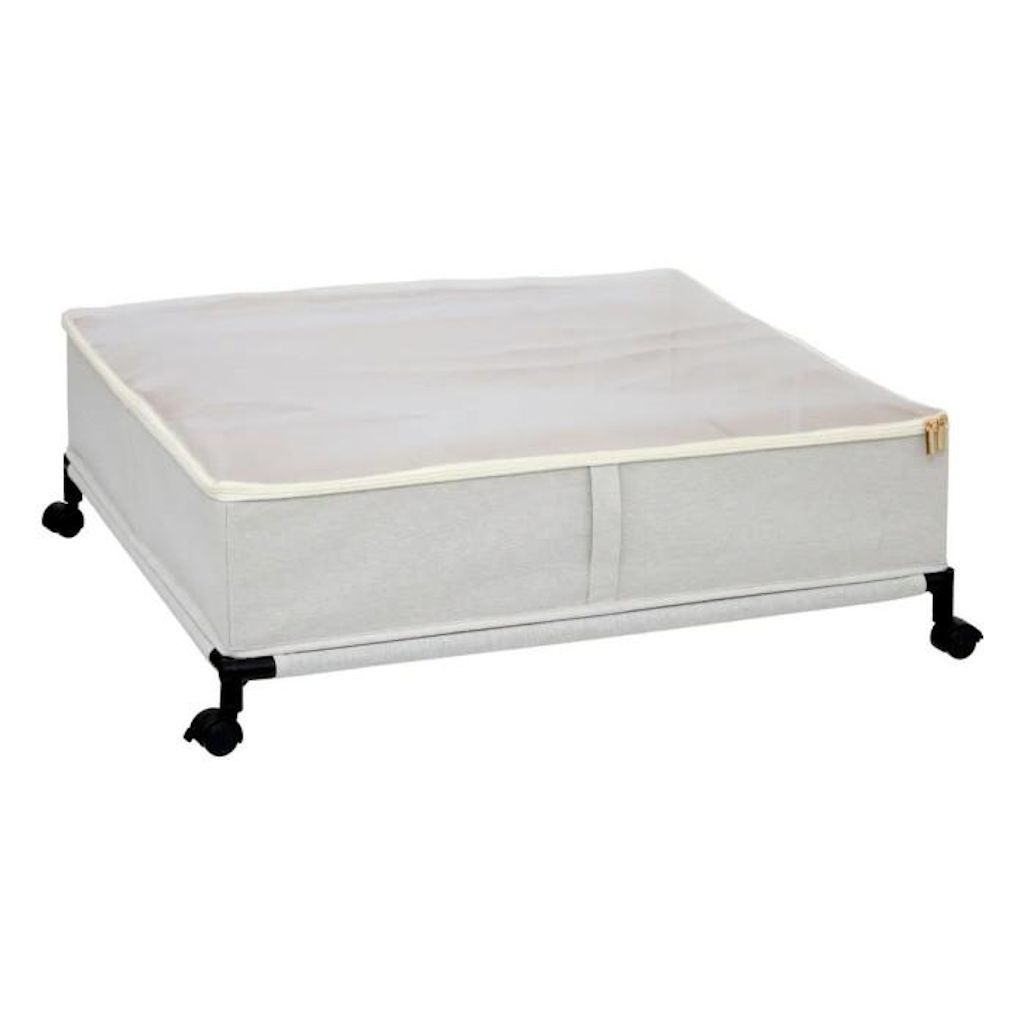 Informations Techniques : Dimensions : L. 66 x l. 60 x H. 22,2 cm Matières : Polyester, Carton & Polypropylène Spécificités : Souple & Utile Housse de rangement Pour dessous de lit Avec 2 poignées Roulettes amovibles 4 séparateurs modulables Couvercle en mesh serré Circulation de l'air Gain de place