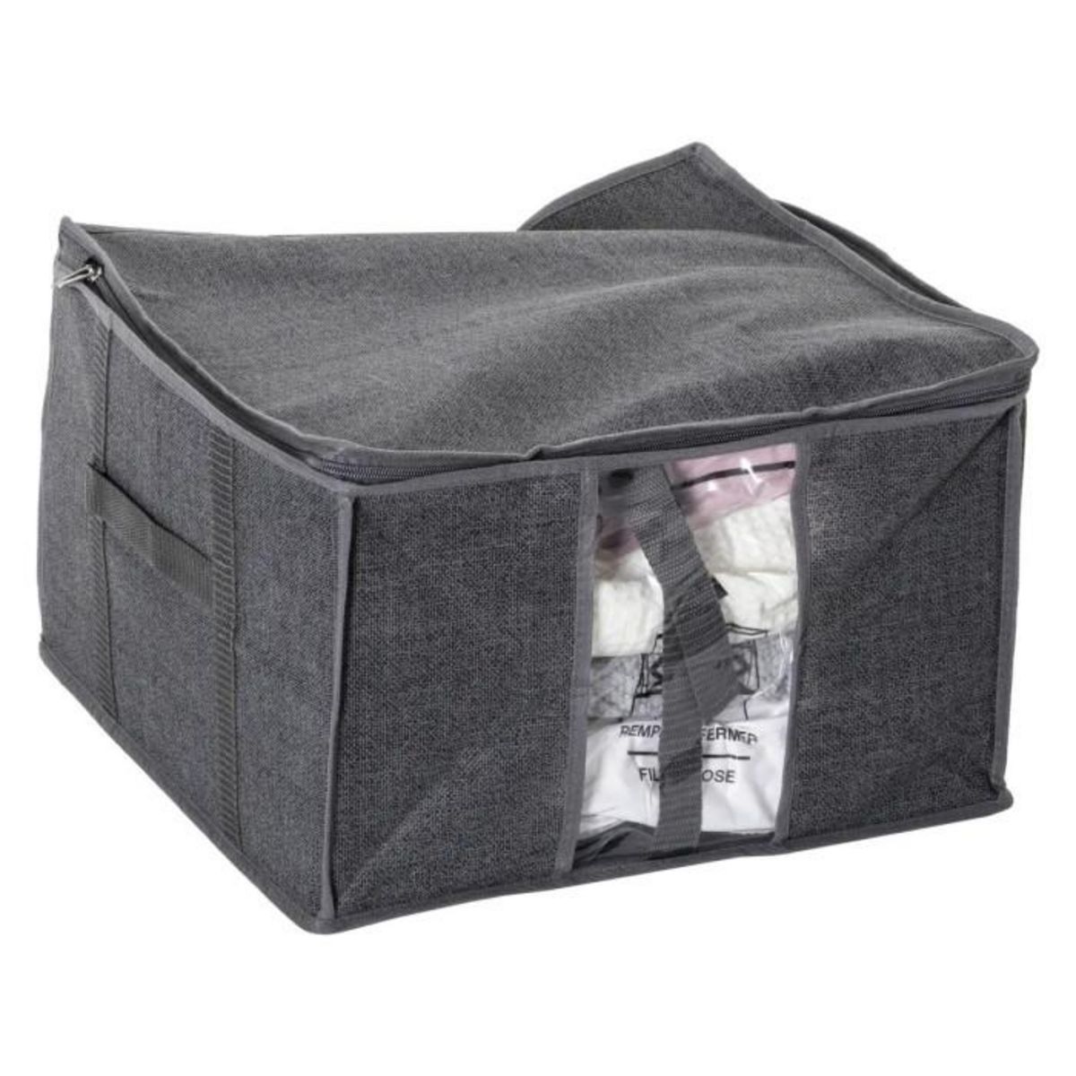Informations Techniques : Dimensions : Housse: L. 40 x l. 40 x H. 25 cm Sac: L. 80 x H. 80 x P. 39 cm Matière : Tissu Spécificités : Pratique & Tendance Housse de rangement Avec sac compresseur 2 Poignées Couleur : Gris
