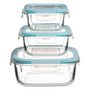 Informations Techniques : Dimensions : Boite 1 : 330 ml: L. 11,3 x l. 11,3 x H. 7,8 cm Boite 2 : 530 ml : L. 13,1 x l. 13,1 x H. 5,1 cm Boite 3 : 1180 ml : L. 17,6 x l. 17,6 x H. 6,7 cm Matières : Verre, Polypropylène & Silicone Spécificités : Haute résistance Hermétique grâce aux 3 clips 3 taille